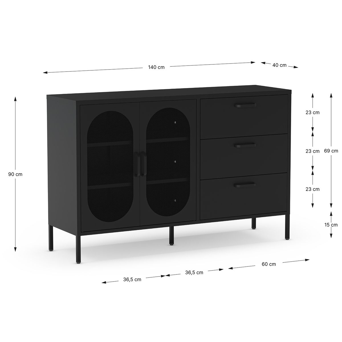 Whether you use it to display your favorite decorative objects or to keep your space neat and organized, our sideboard will be the focal point of your home. Black is the foundation of timeless decor. Elegant and versatile, it always adapts to any style and adds a touch of refinement. The use of metal in the decor transforms the ambiance, creating an atmosphere of strength and elegance that leaves a lasting impression. Make your home a sanctuary of style and comfort with Quality. Furniture that speaks of quality and good taste. Take advantage of this offer!