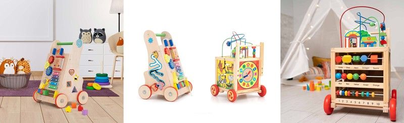 The ride-on with activities made of multicolored pine works in the same way, which has up to five game sides, also including a part for storage.