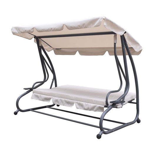 Dominique garden swing seat convertible into bed made of anthracite gray steel frame. Indicated for summer afternoons, place it on the porch, terrace or garden of your house and rest while you swing in this comfortable seat. It is designed so that two to three people can sit. The seat has a cushion and backrest made of 160 gr / m² beige polyester. To protect from direct sun and rain, it has an awning, also beige. This set is assembled easily and quickly without the use of tools. It is easily cleaned and requires no maintenance. Made with high quality and durable materials. Its cushions are very comfortable to spend long periods outdoors. It has the advantage that it converts into a comfortable bed in a simple way for a better rest. In his arms are coasters to keep your favorite drink close at hand. The dimensions of this balacín are 120x230x164 cm.